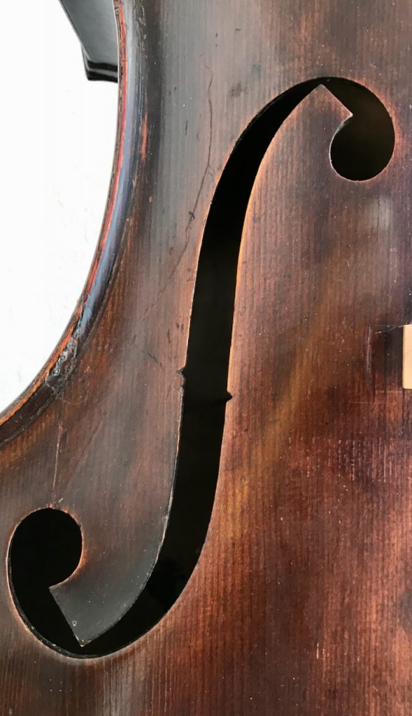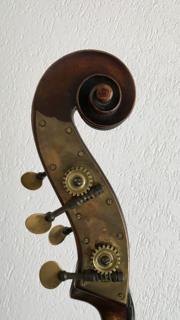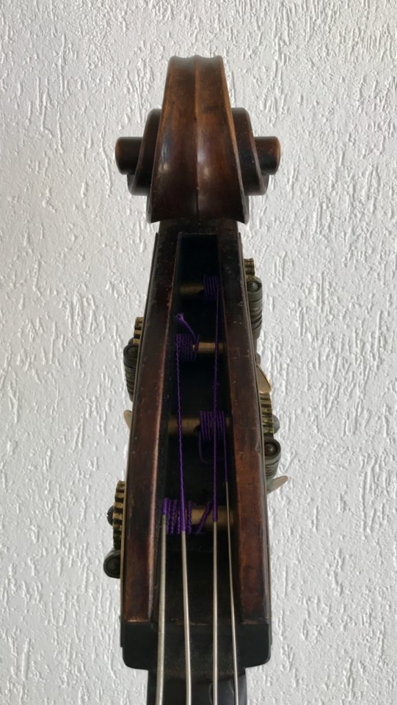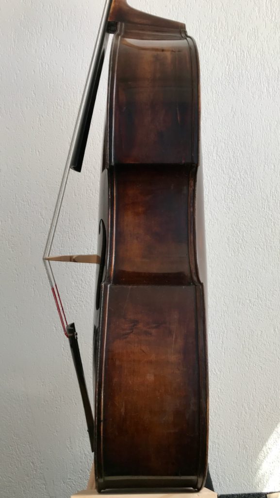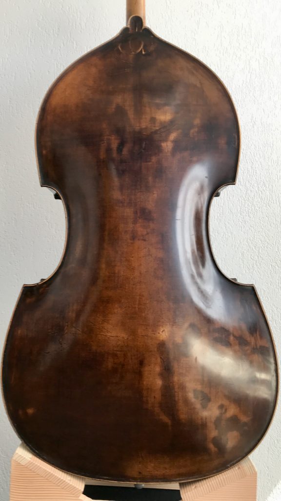Gambenform, dunkelbrauner Lack, gewölbter Boden, sehr guter Zustand. Eingerichtet von Urs Breitenmoser.